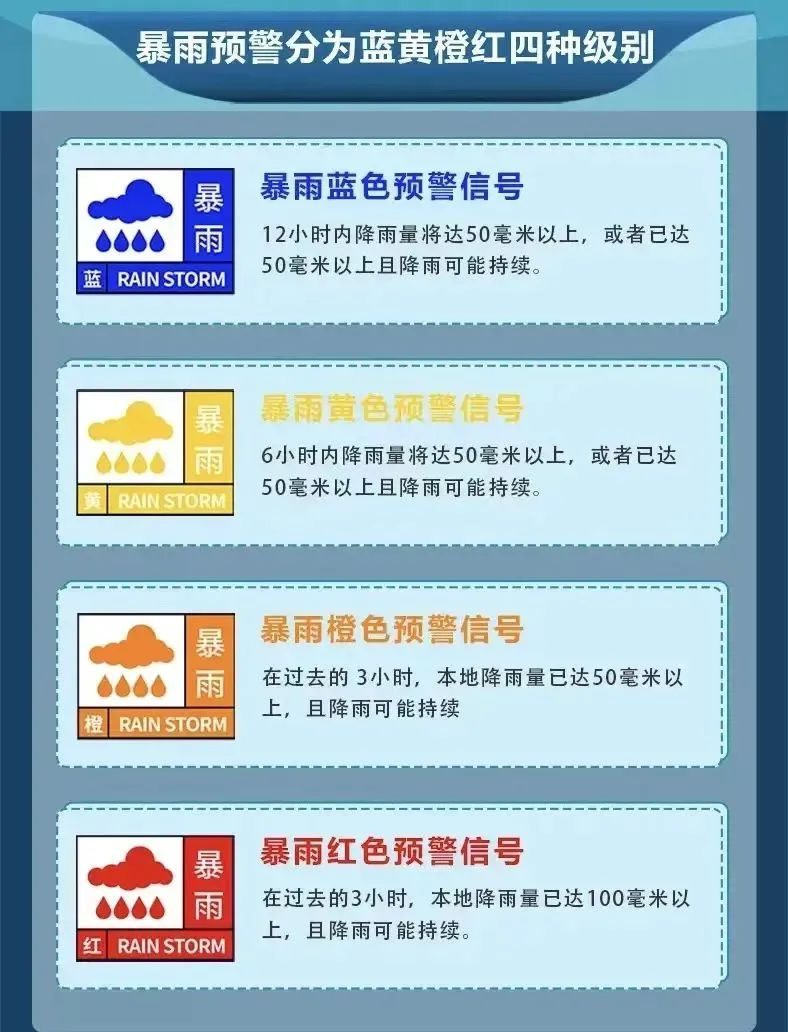 暴雨預(yù)警信號(hào)是氣象部門(mén)通過(guò)氣象監(jiān)測(cè),在暴雨到來(lái)之前做出的預(yù)警信號(hào),暴雨預(yù)警信號(hào)分四級(jí),分別以藍(lán)色、黃色、橙色、紅色表示。