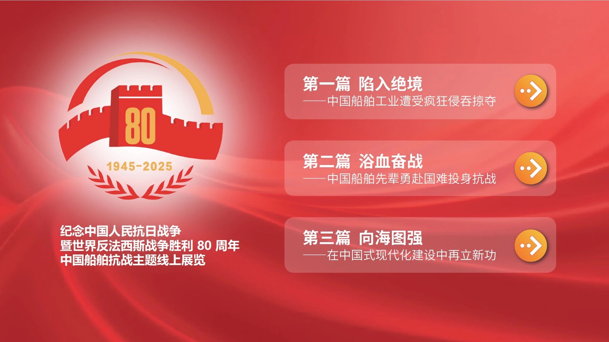 9月4日,在紀(jì)念中國人民抗日戰(zhàn)爭暨世界反法西斯戰(zhàn)爭勝利80周年之際,中國船舶集團(tuán)有限公司“追尋紅色記憶 弘揚(yáng)抗戰(zhàn)精神”主題線上展覽上線發(fā)布。