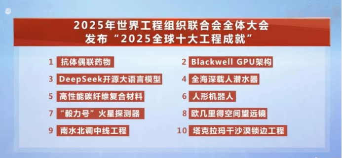 由中國工程院院刊《Engineering(工程)》評(píng)選,經(jīng)由全球征集提名、專家遴選推薦、公眾問卷調(diào)查、評(píng)選委員會(huì)審議后確定,具有高度權(quán)威性和國際影響力。本次入選項(xiàng)目涵蓋航天探索、資源開發(fā)、人工智能、材料科學(xué)等多個(gè)領(lǐng)域。與“奮斗者”號(hào)全海深載人潛水器一同入選的還有Deepseek開源大語言模型、南水北調(diào)中線工程等全球重大工程創(chuàng)新成果。