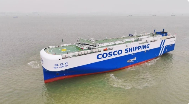 4月21日,中船集團旗下廣船國際聯(lián)合中船貿(mào)易建造的7000車液化天然氣(LNG)雙燃料動力汽車運輸船“漢江口”號舉行命名交船儀式。據(jù)了解,該船交付后,首航次將從上海裝載國產(chǎn)汽車奔赴智利、秘魯、危地馬拉等國家。